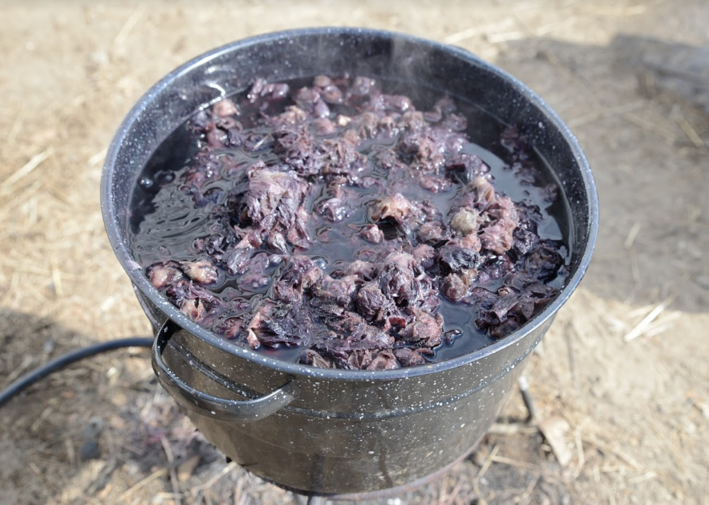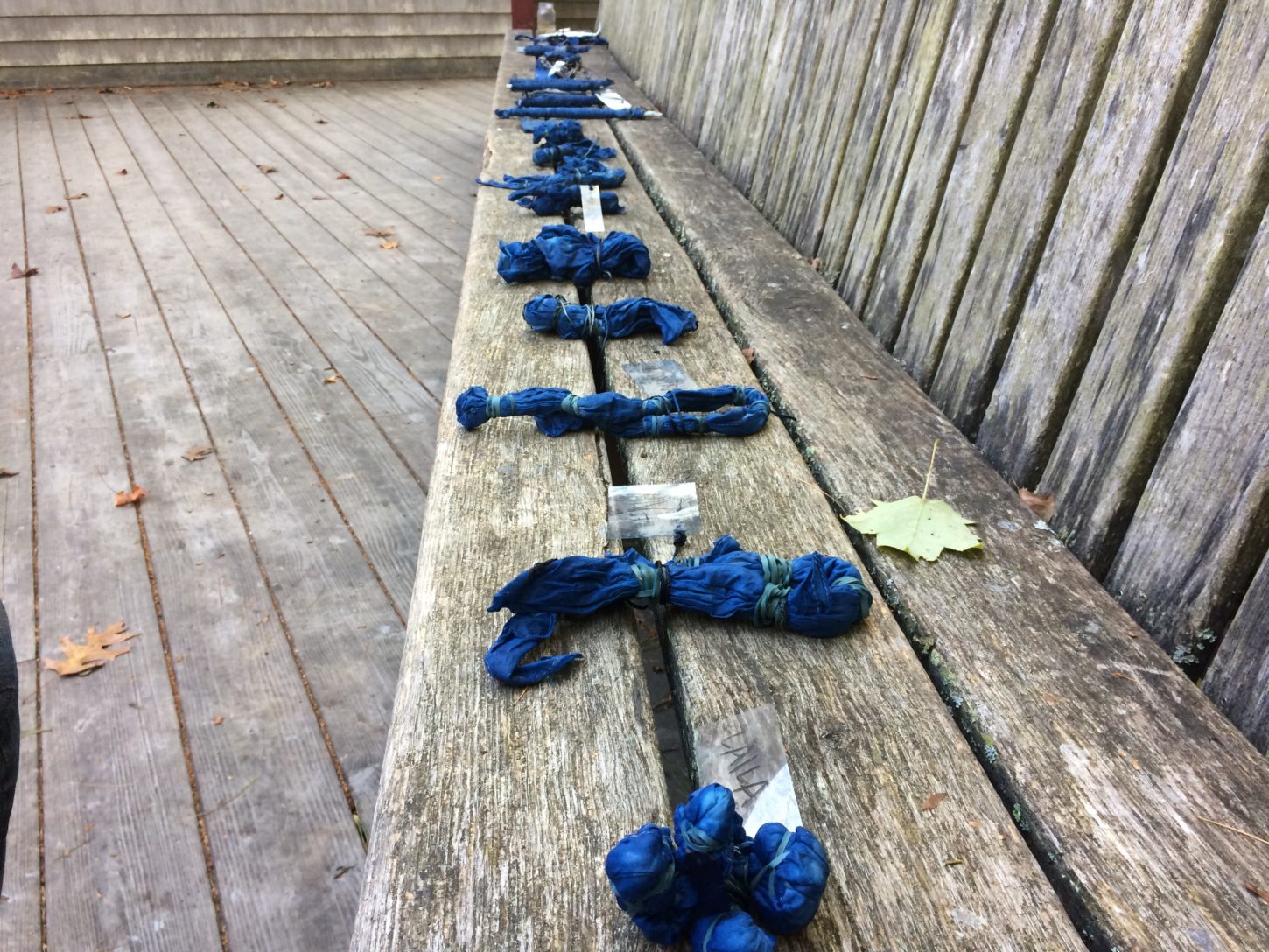This summer and fall, participants in programs across Chewonki – from Boys Camp to the Elementary School to the Maine Coast Semester – have been dyeing cotton fabric and farm wool with Japanese indigo. This plant, carefully cultivated on the farm since we seeded it indoors in early April and transplanted it into the dye garden in late May, thrived this year in our hot summer and fall. Looking at the green leaves of this annual plant, you’d never guess the blue that hides within.
