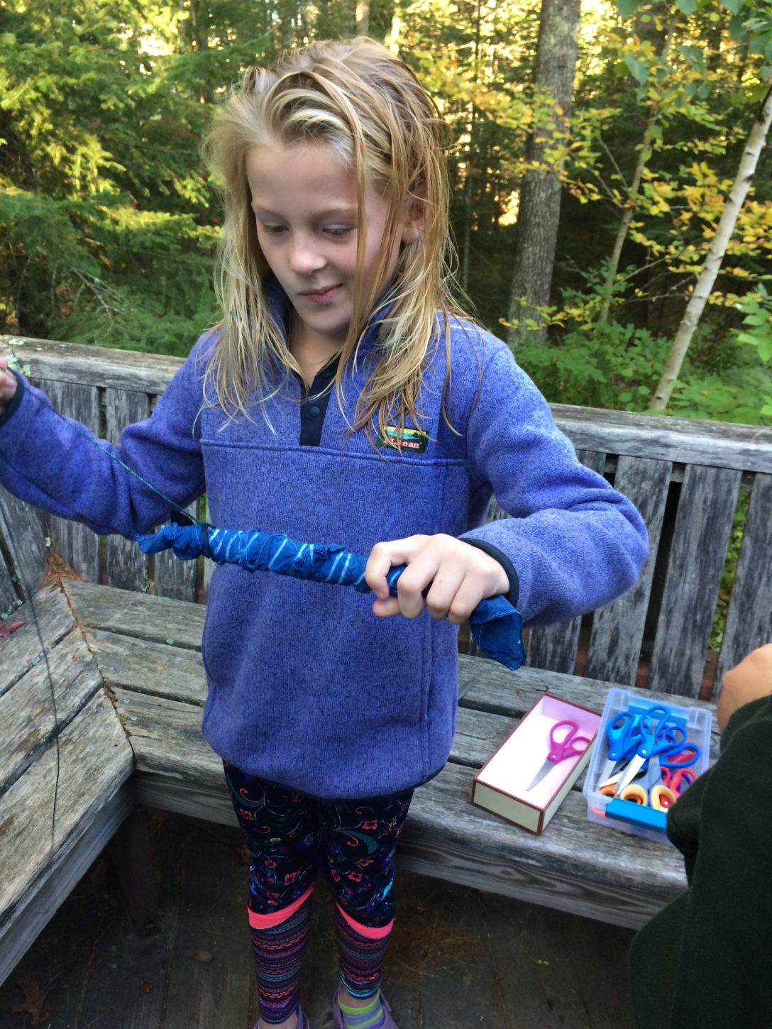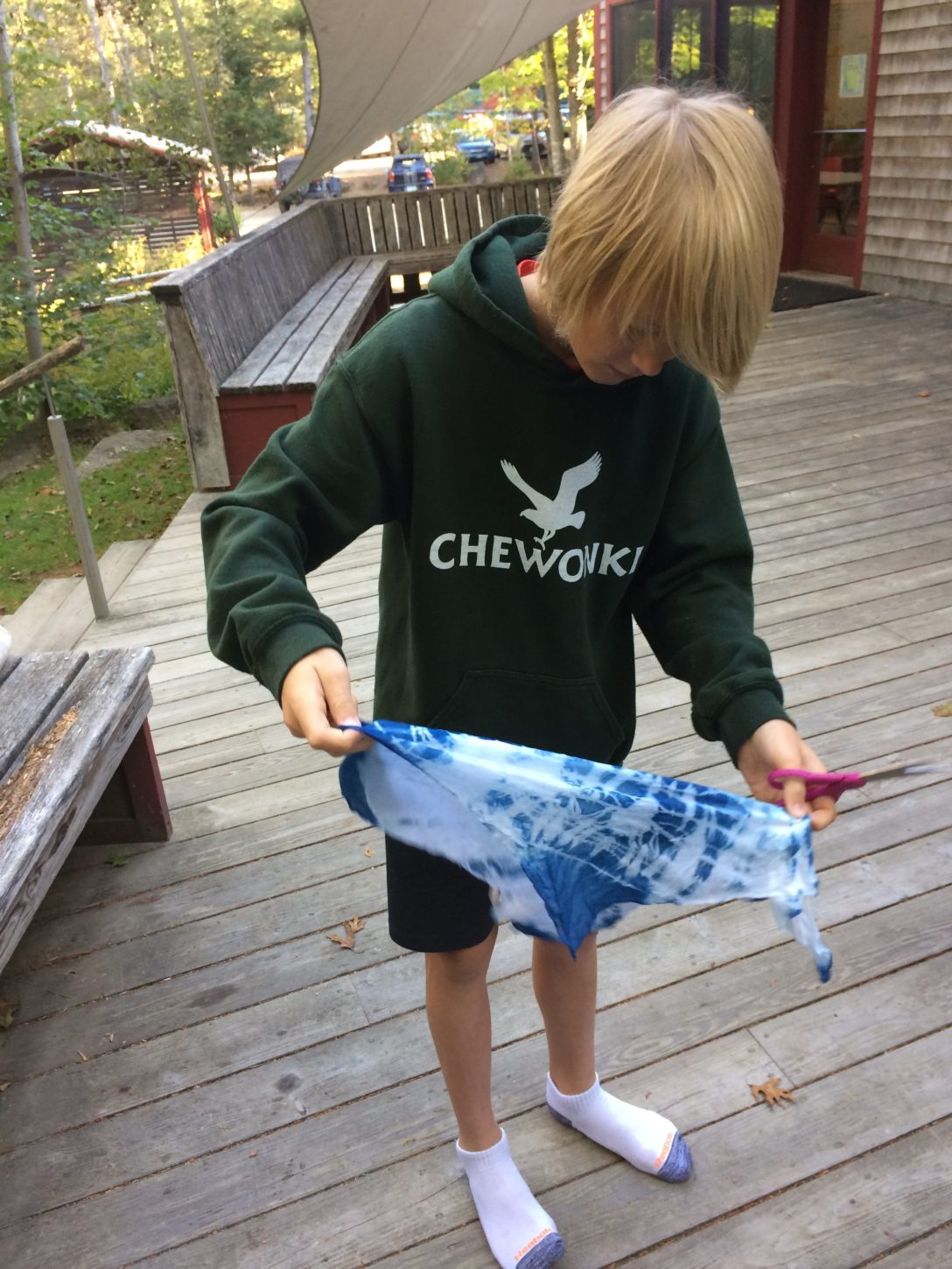 Boys campers and elementary schoolers experimented this year with shibori dyeing, a traditional Japanese dyeing technique that employs all sorts of materials and approaches – rubber bands, pleats, twists, compressions, clips, wood, posts – to create resist, leading to swirls and patterns in many shapes and sizes.