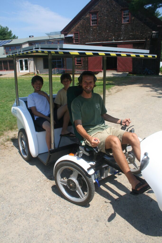 Tom Twist and students with a solar- and bicycle-powered utility vehicle. This was one of many hands-on experiments in rethinking how we move around campus.