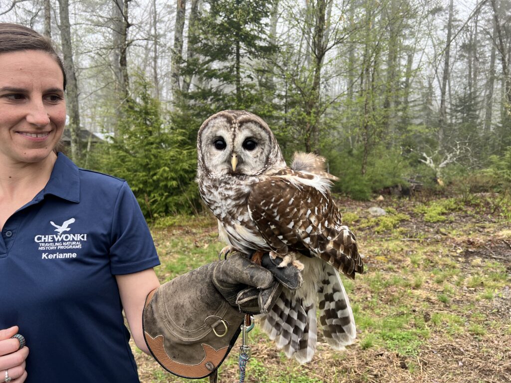 CEE Director Kerianne Gwinnell with one of Chewonki’s barred owls, part of the wildlife center’s work connecting people to the natural world.
